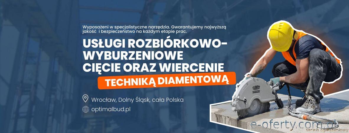 Nasza firma Optimalbud od ponad 15 lat realizuje profesjonalne usługi budowlane i rozbiórkowo-wyburzeniowe na terenie Wrocławia, Dolnego Śląska i całej Polski. Specjalizujemy się w precyzyjnym wierceniu i cięciu techniką diamentową, kompleksowych pracach rozbiórkowych oraz wyburzeniach konstrukcji betonowych i innych elementów. W ramach naszej oferty wykonujemy również montaż podciągów stalowych, przebudowy budynków, kucie betonu, likwidację balkonów, tarasów, schodów, ścian i ogrodzeń, demontaż sufitów, szlifowanie ścian oraz poszerzanie otworów w ścianach nośnych. Dzięki nowoczesnemu sprzętowi i doświadczonej ekipie zapewniamy bezpieczeństwo, rzetelność oraz efektywne wykonanie każdego zlecenia.